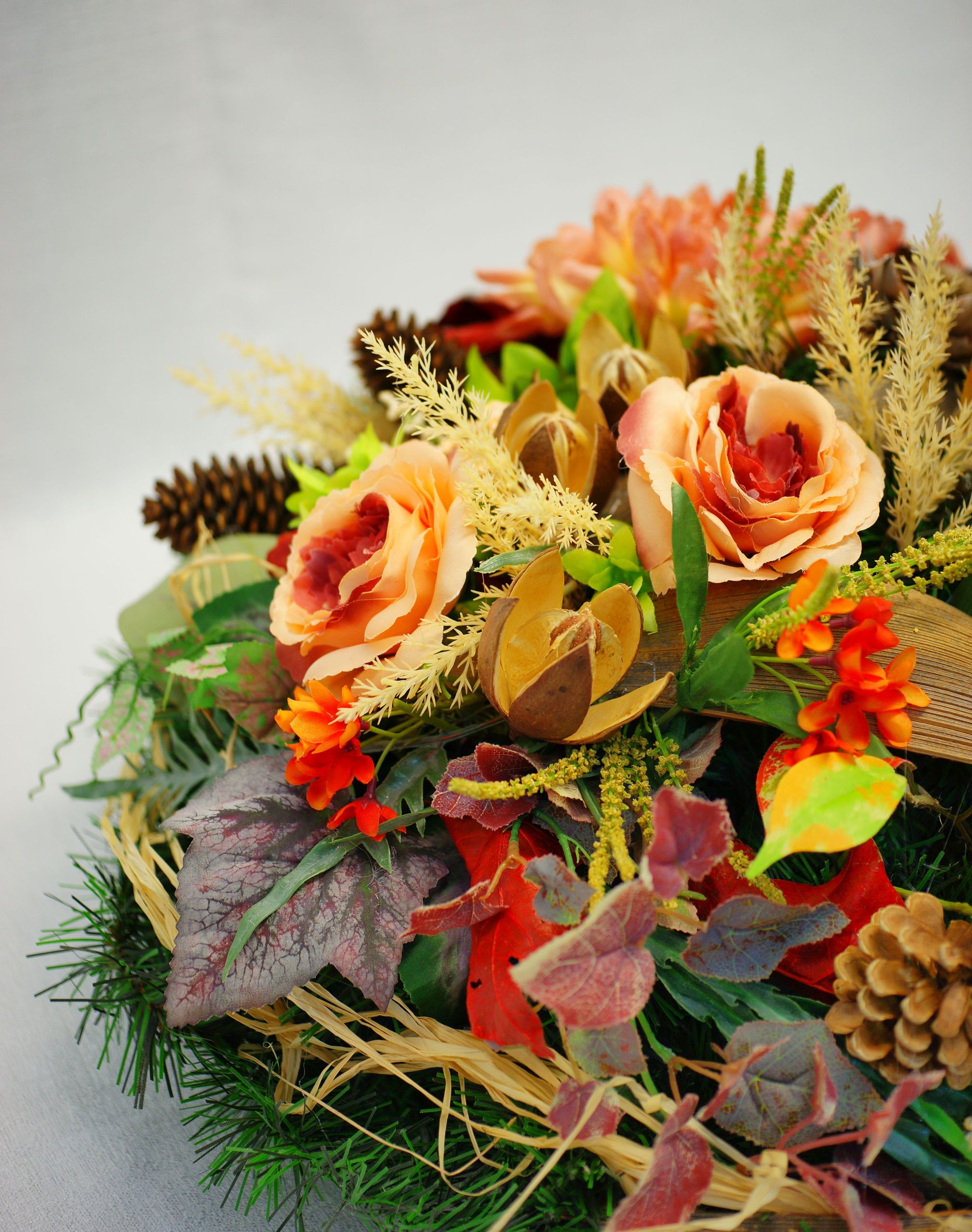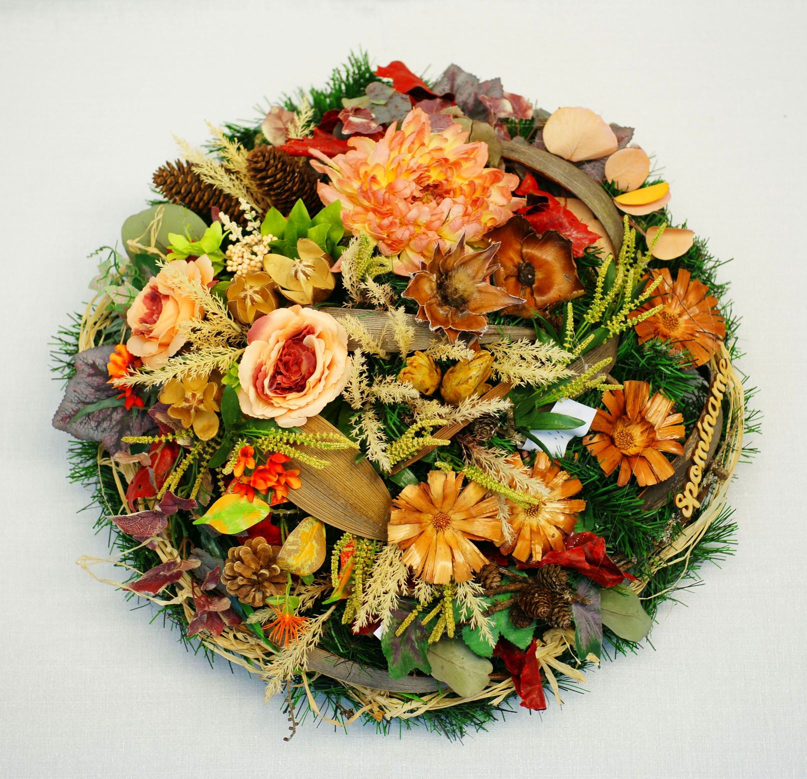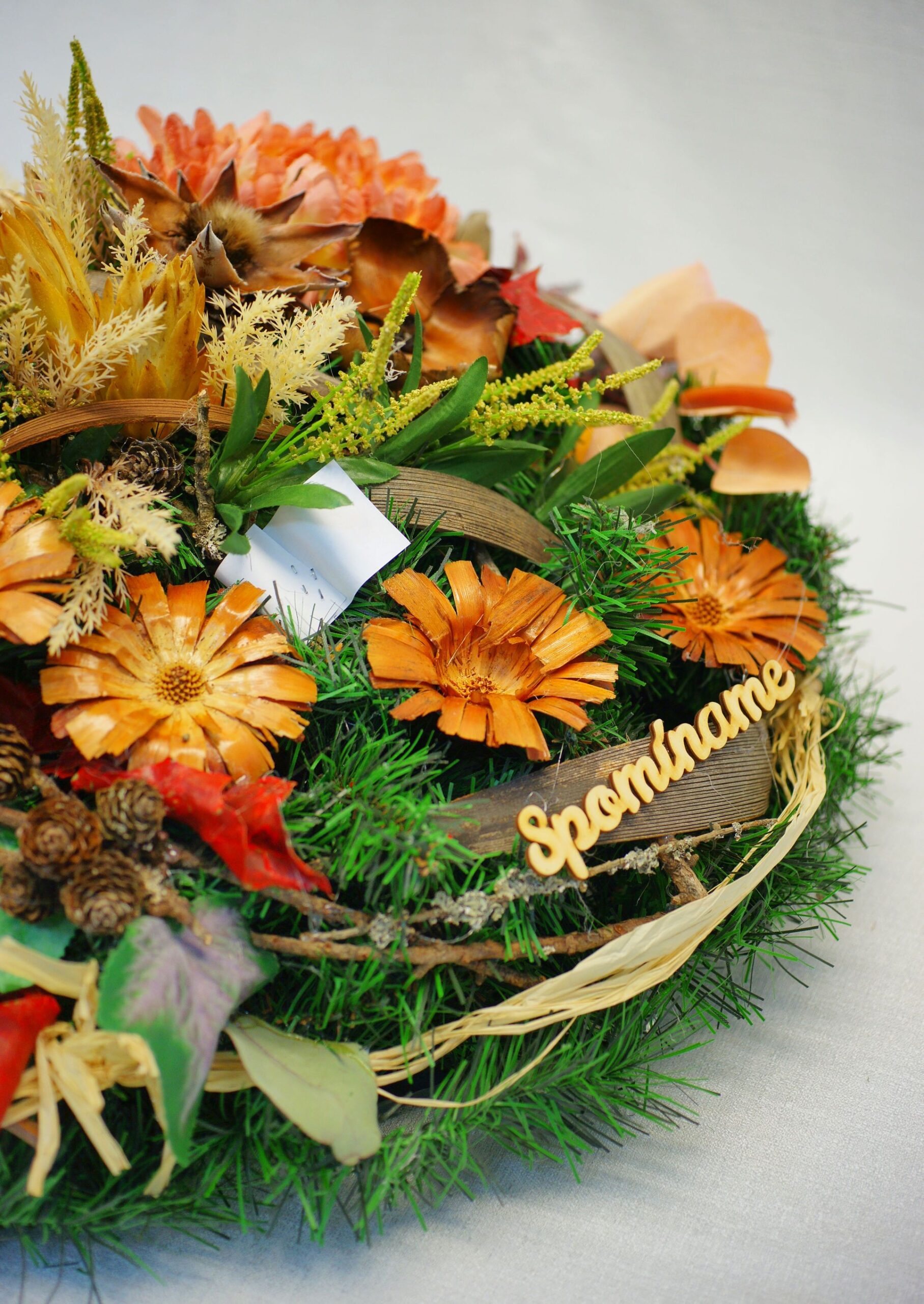 Smútočná dekorácia na hroby – veniec z ihličia a umelých kvetov.